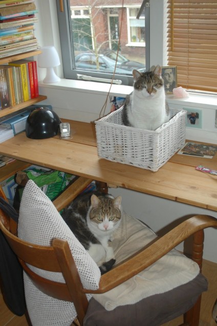 Tussen de heren ex-zwervers gaat het de laatste tijd een stuk meer ontspannen. Ik zie soms zelfs een voorzichtige poging tot neuzen. Fijne plekken bij elkaar in de buurt maken bevordert de sfeer, dus maakte ik er ook eentje boven en bespoot dat met kattenkruidspray. Gerrie ligt vaak op deze stoel. Binnen 5 minuten nadat ik een lekker kleedje in het witte mandje had gelegd, kroop Dibbes erin. Dibbes is wel iets te groot de mand is weliswaar iets te klein, maar Dibbes kan zich heel goed oprollen. Als Gerrie boven slaapt, ligt Dibbes daar ook. Gaat Gerrie naar beneden, dan hobbelt Dibbes er meestal achteraan. Of dat nu nieuwsgierigheid is, of houd-de-vijand-in-de-gaten weet ik niet, maar het ziet er voor een buitenstaander momenteel vrij relaxt uit.