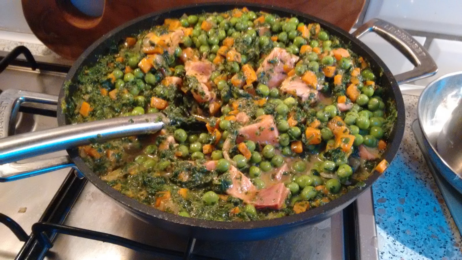 Op donderdag schuiven er tegenwoordig vaak vrienden aan wegens ‘omstandigheden’. Het komt zo uit en het zijn mensen die geen aanslag op mijn energie plegen. Koken en eten moeten we toch, dus eet maar lekker mee. Maar donderdag was een wat slechtere dag qua energie en dan stap ik over op een noodplan: iets maken wat ik al zo vaak maakte dat het geen enkele moeite kost en van spul wat altijd wel op voorraad is: spinazie, doperwten, bataat , zalm en kokosmelk. Dit gerecht maak ik zeker eens per week. Soms met kip of gehakt in plaats van met vis, maar het is altijd lekker en het mislukt nooit. Het volledige recept vind je op mijn kookblog.