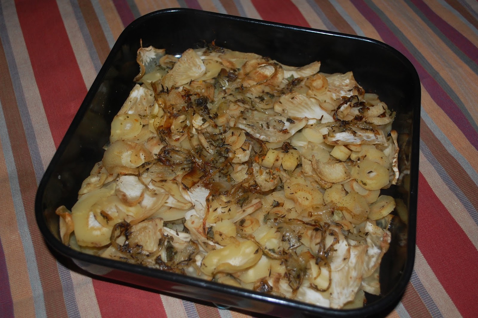 Knolselderij wordt hier veel gegeten. Vaak rooster ik het in de oven met een beetje olie, mint, paprika, honing en knoflook, lekker! En we eten het ook regelmatig met gehakt bijvoorbeeld met een kerrie-saffraan kruiderij, gehakt en aardappel. Dit keer besloot ik een vegetarisch gerecht te maken: een ovenschotel van knolselderij en pastinaak, naar een recept van Jamie Oliver. Zo werd meteen het probleem opgelost van die pastinaak die al weken in de groentela aandacht lag te trekken. Erbij aten we risotto met de pesto die ik na enig zoeken in de vriezer aantrof. Lekker! Dit gaan we zeker vaker eten.