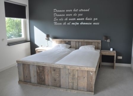 Het bed is een bouwpakket van steigerhout dat we kochten bij dezelfde zaak waar we ook onze tafel kochten die naar verwachting over 2,5 week geleverd wordt. M. wilde eigenlijk zelf een bed bouwen maar we hadden geen hout op voorraad meer en de prijs van het bouwpakket van steigerhout was zodanig dat het wel heel gunstig uitpakte. Het is natuurlijk prettig dat alles op de juiste maat is gezaagd. Dat scheelt ook weer tijd en kosten.