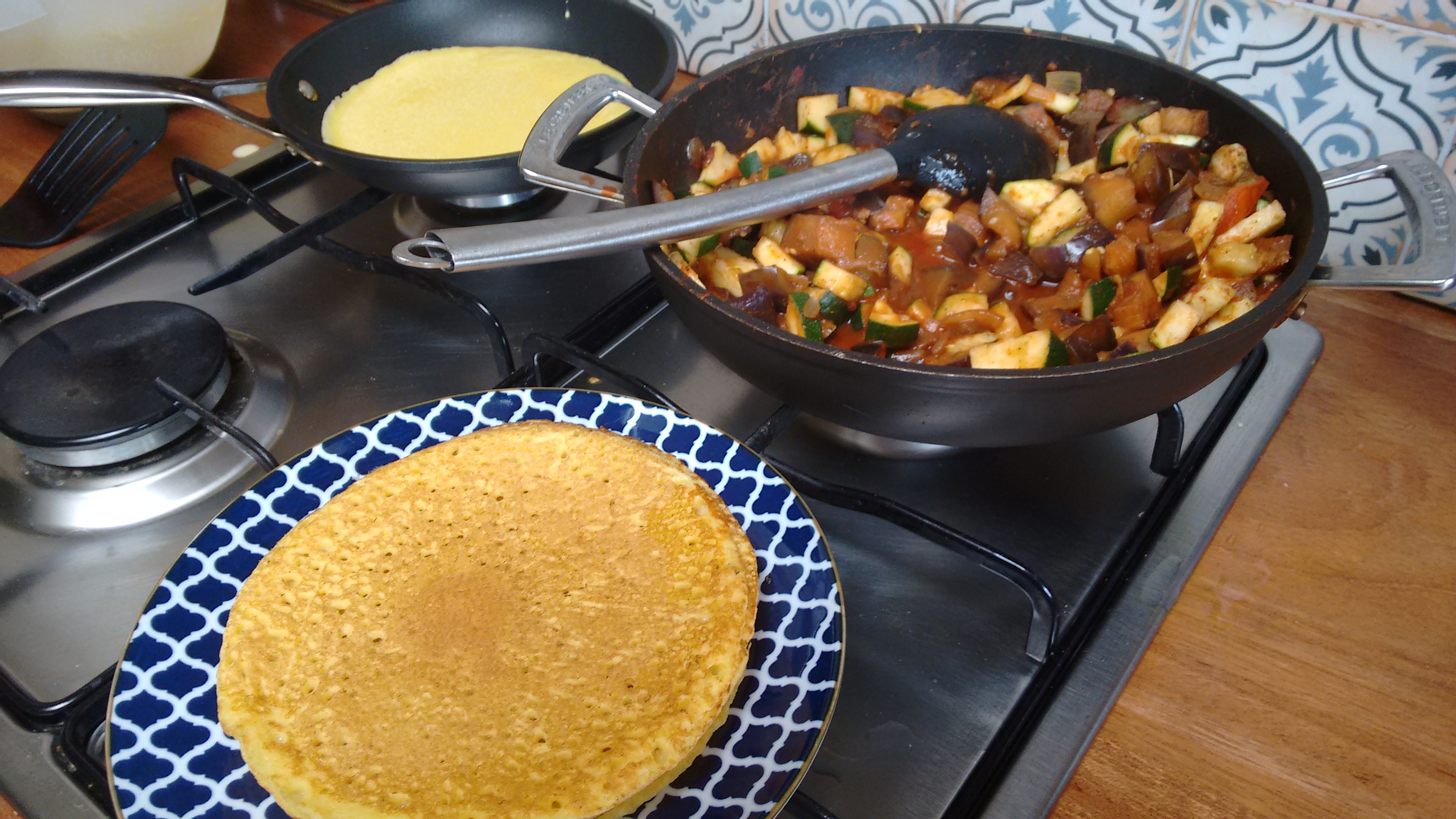 Voor de pannenkoekjes heb je nodig (zo om en nabij): ca 200 gram maïsmeel, 200 ml sojamelk of amandelmelk ( of gewone, als je dat verdraagt), 2 eieren, peper, zout