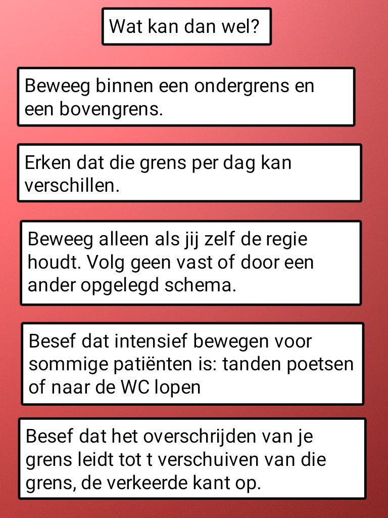 Toen bij mij fibromyalgie werd geconstateerd door een fysiotherapeute is er ook al test een bewegingsprogramma opgesteld. De eerste 2 weken gingen redelijk toen moest er een stapje bij en na weer 2 weken kon ik minder dan in het begin. Binnen mijn grenzen beweeg ik best wel veel nu omdat ik weet hoe het moet