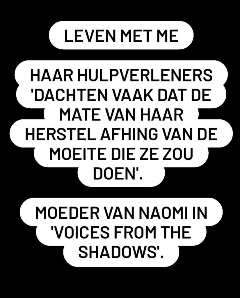 Je zou al bang zijn dat iemand een correcte diagnose ME zou krijgen, want dan is die ziekte onbegrepen en niet adequaat te behandelen. Om bij voorbaat al moedeloos van te worden. Hoe het na jaren ziek zijn is, daar kan ik me nauwelijks een voorstelling van maken. Omhelzing op afstand.