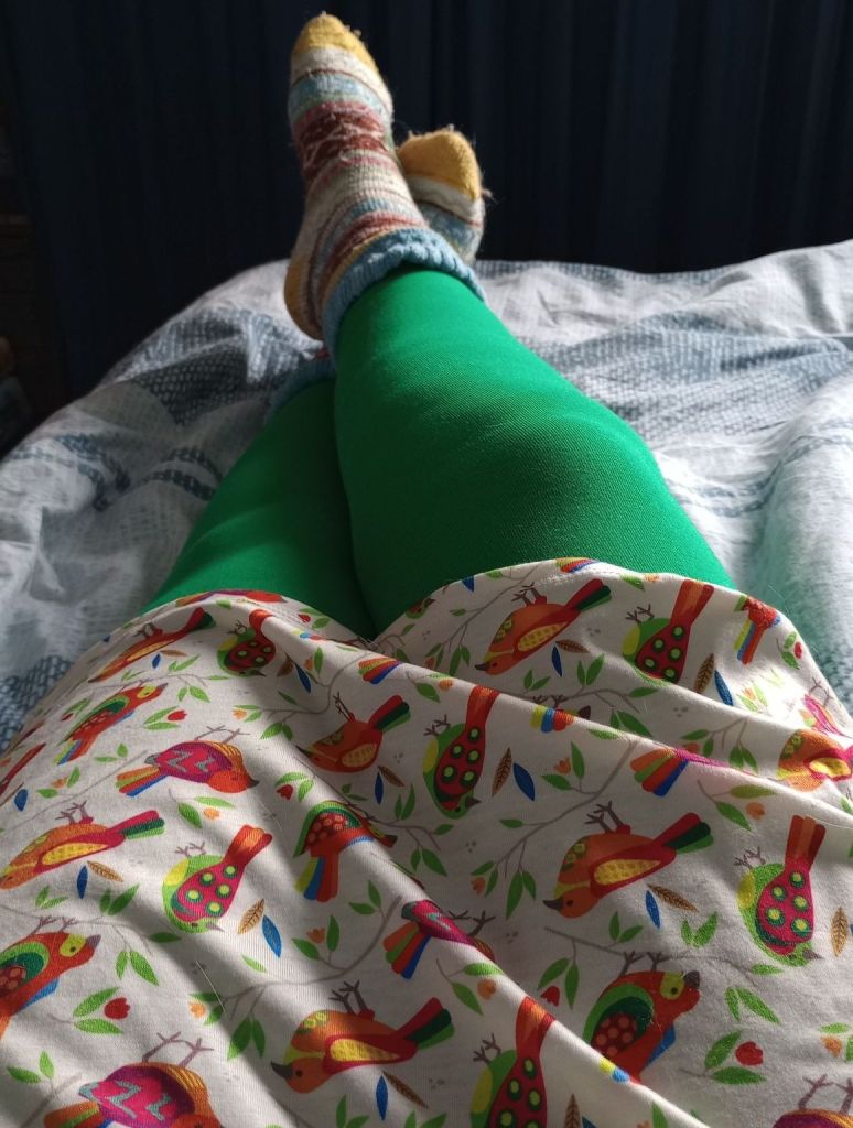 Ik lig tussendoor te rusten in mijn feestkleding om het allemaal wat vrolijker te maken.