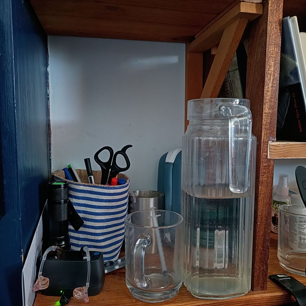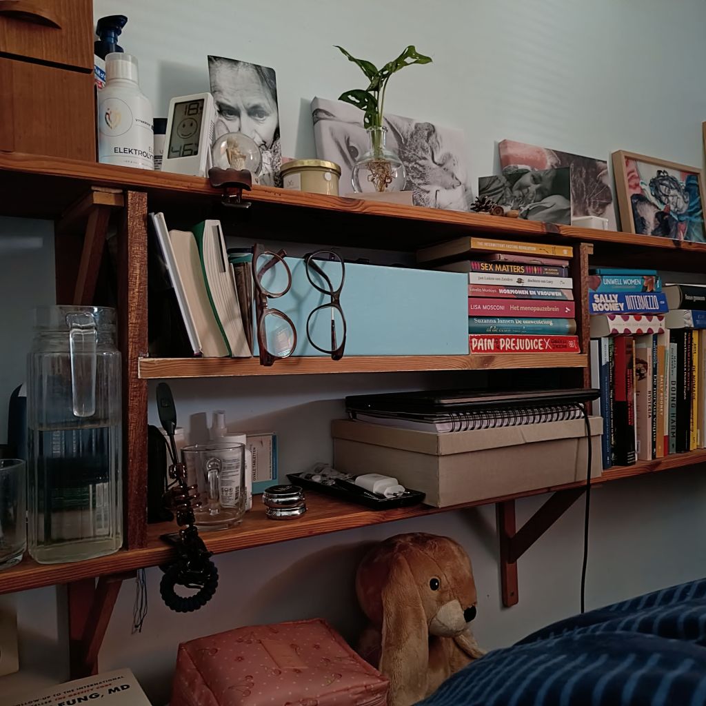De foto’s tonen mijn uitzicht. De plank naast me, waar alles staat wat ik nodig heb, van water tot zelfzorgspullen en boeken die ik lees. Op bed mijn tablet, altijd binnen grijpafstand.