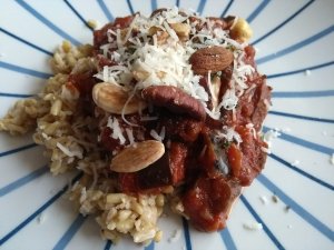 Om de parasiet te bestrijden ben ik gestart met een traject bij een diëtist die gespecialiseerd is in darmproblemen. Na een paar maanden wachttijd was het vorige maand zo ver. Inmiddels ben ik 5 weken bezig met een door haar voorgeschreven dieet en supplementen. Ik zal er binnenkort over schrijven. Maar lekker eten gaat altijd door hier. Bovenstaand was een schoteltje met aubergine, tomatensaus, haver en geroosterde nootjes.