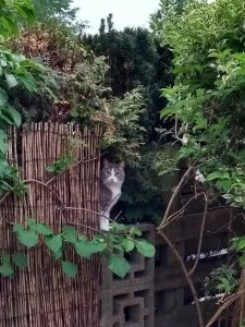 Buurkat Eddie komt ook weer buurten. Omdat ik hem de hele winter niet had gezien, vroeg ik pas nog aan zijn personeel of hij het nog wel deed. Eddie blijkt een zomerkat te zijn, in de winter heeft hij geen zin om buiten te komen. En zie, met het mooie weer kwam hij weer gluren. Hij gedraagt zich inmiddels wel beter en eerbiediger naar onze katten toe, dus die tolereren zijn bezoekjes inmiddels. Hij is vooral erg nieuwsgierig.