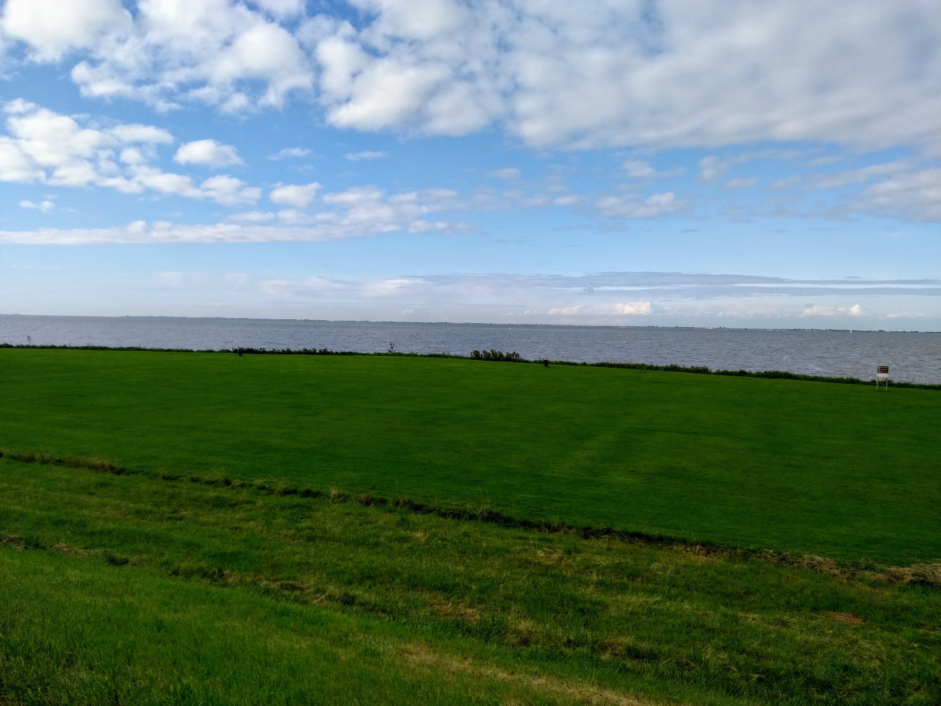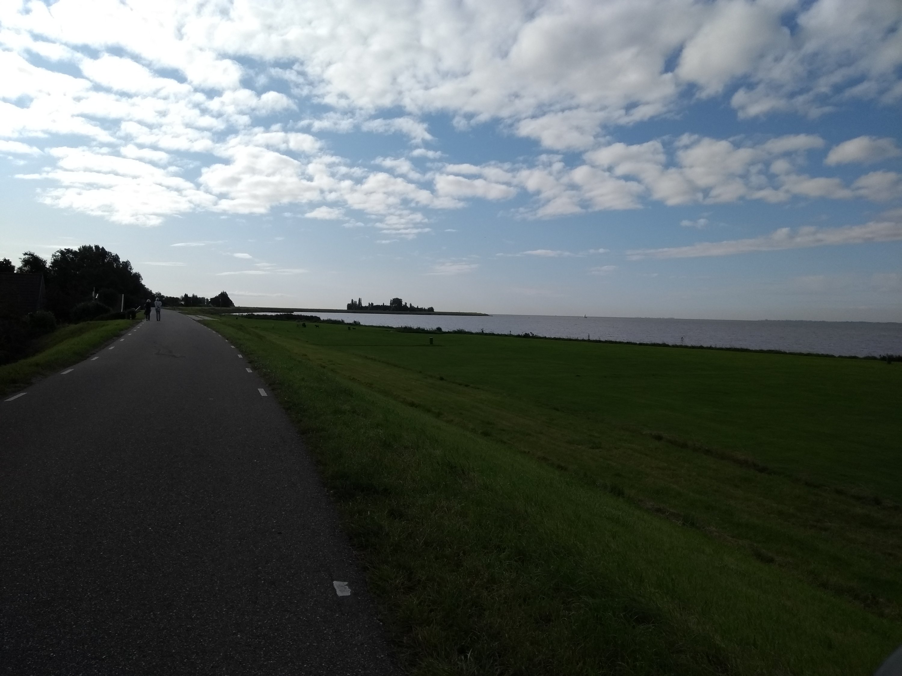 Om 11 uur reden we op de dijk langs het IJsselmeer, ik op de scooter en M. op zijn fiets. Het was er onvoorstelbaar rustig. Misschien omdat de voorspellingen vooraf helemaal niet goed waren geweest en mensen andere plannen hadden gemaakt? Op een enkele fietser na, kwamen we niemand tegen.