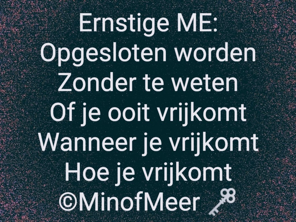 Stilstaan bij patiënten dus die ernstige en zeer ernstige ME hebben. Die huisgebonden leven en meestal bedgebonden, hulp nodig hebben bij dagelijkse handelingen, zeer geïsoleerd leven, vaak in het donker. Die soms niet meer kunnen eten en sondevoeding krijgen. Die soms niet meer kunnen praten of aanraking verdragen of welke vorm van contact ook aankunnen.