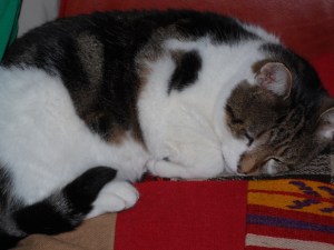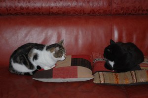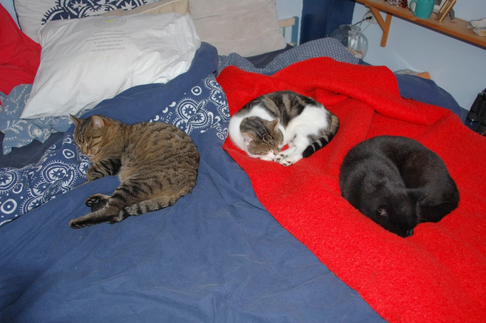 De rust keert hier weer terug in huis. Op het moment dat ik dit stukje tik zit ik op bed en liggen er twee katten vlak bij elkaar te ronken. De feliway in combinatie met het opvoeden van Dibbes werkt dus goed. Hij leert snel en hij reageert goed. In plaats van in onze handen klappen of nee roepen, duwen we hem nu gewoon weg bij ongewenst gedrag en dat begrijpt hij én hij wordt er niet angstig van. Belangrijk, gezien zijn verleden.