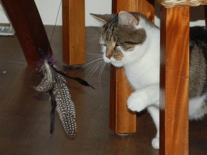 Omdat Moos zich naar Dibbes toe als een dooie sukkel gedraagt, spelen wij maar zoveel mogelijk met hem. Veel met touwtjes maar gewoon een brokje door de kamer gooien is ook een groot succes, hij ‘tennist’ er dan tijden mee. En hij speelt soms met de buurkat die nu ongeveer 6 maanden is. Maar die proberen we zoveel mogelijk uit dit huis te weren want hij is erg opdringerig en denkt dat het hier leuker is dan in zijn eigen huis. Drie katten is genoeg. Helaas lukt het buiten houden niet altijd (moeilijk met een kattenluik), laatst trof ik hem in de huiskamer aan spelend met vier kerstballen die hij uit de boom had weten te meppen…..