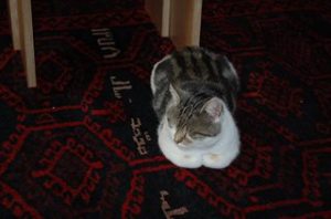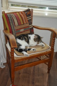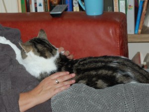 Tussen Dibbes en de andere twee katten gaat het wisselend. De afgelopen maanden zagen we dat ze veel van elkaar kunnen hebben. Maar een kat tolereren die regelmatig in de tuin zit, is iets heel anders dan een kat accepteren die ineens in het huis woont. Vooral Moos heeft het er moeilijk mee, iets wat Dibbes feilloos aanvoelt en uitspeelt. Er is dus wat geblaas en gegrom waar ik me zo min mogelijk mee probeer te bemoeien, ze zullen het zelf moeten uitzoeken. Wel hebben ze allemaal hun eigen plekje zodat ze zich kunnen terugtrekken en als het te heftig wordt, grijp ik in.