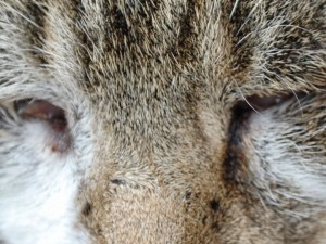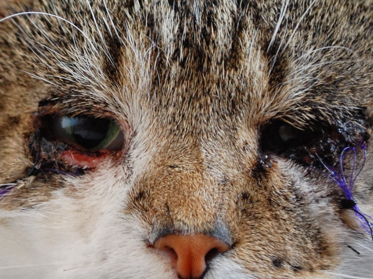 Gelukkig is entropion te verhelpen met een operatie waarbij de onderoogleden worden ingesneden en naar buiten worden gerold en vastgezet met hechtingen. We konden eind van de middag een zwaar toegetakelde kat zonder ballen en vol met hechtingen ophalen. Normaal krijgt een kat dan een kap om zijn kop om te voorkomen dat hij gaat krabbelen, maar dat is bij hem niet gelukt. Zonder kap dus. De oplossing was hem 9 dagen versuft te houden in een aparte kamer, totdat de hechtingen eruit konden.
