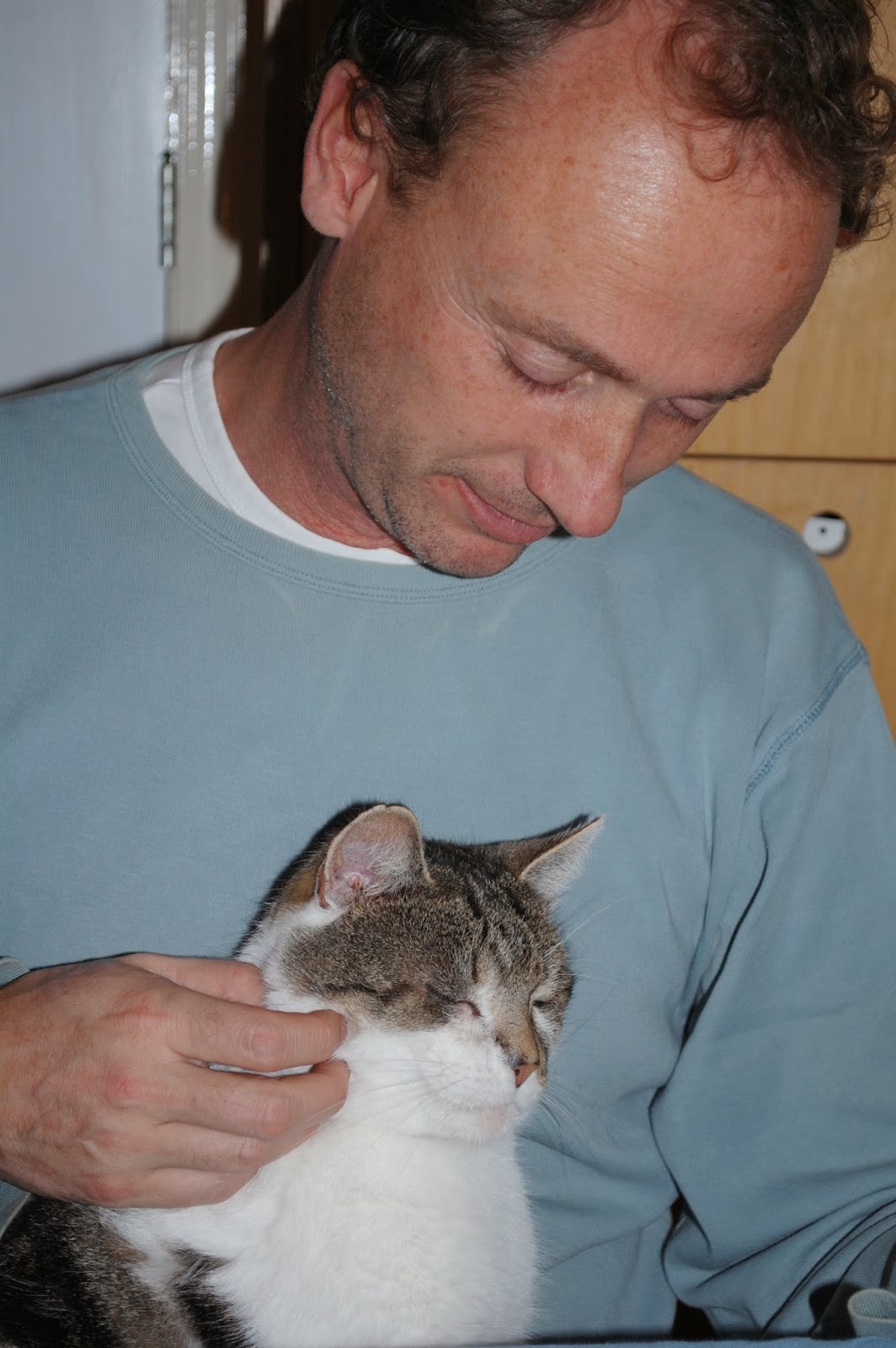 Wat zeker niet meehielp aan een ontspannen gevoel was dat na een paar dagen zijn ogen begonnen te ontsteken. Naast de kalmeringsmiddelen en pijnstillers moesten we nu ook een paar keer per dag zijn ogen druppelen. Een hels karwei want het beest is bang voor veel en vooral voor mensen die hem stevig vastpakken en dan iets in zijn ogen druppelen. Ik was erg bang dat zijn fragiele vertrouwen in ons een flinke deuk zou oplopen. Het ontroerde me dan ook enorm dat hij toch weer keer op keer naar ons toekwam en zich overgaf aan knuffels.