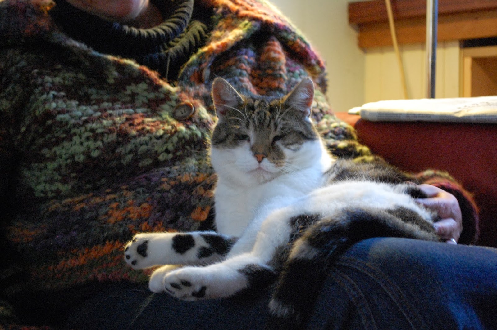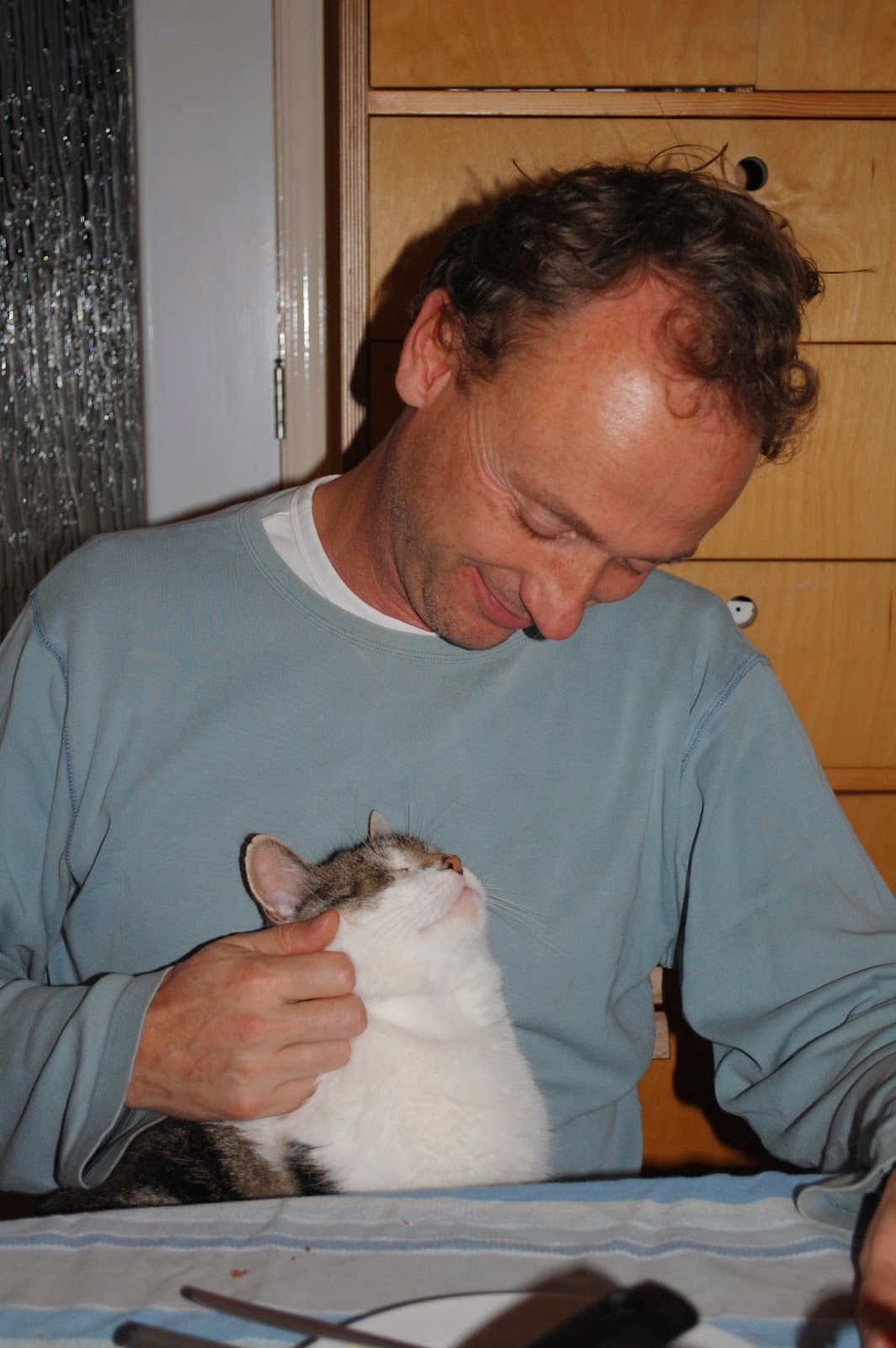 Vorige maand kwam de doorbraak, we mochten hem aaien. Daarna ging het snel. Binnen een week lag hij binnen op het kleed, toen op de bank en toen op schoot. Al zijn de voeten van M. ook erg fijn om op te liggen. Door het voor hem geïnstalleerde kattenluik kan hij nu komen en gaan wanneer hij wil. Vorige week maakten we voor het eerst mee dat hij al in de keuken zat toen we in de ochtend naar beneden kwamen.