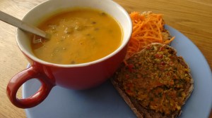 - zelf gebakken brood van teffmeel met als beleg harde kaas of tomaat/komkommer maar ook wel gewoon pindakaas of appelstroop