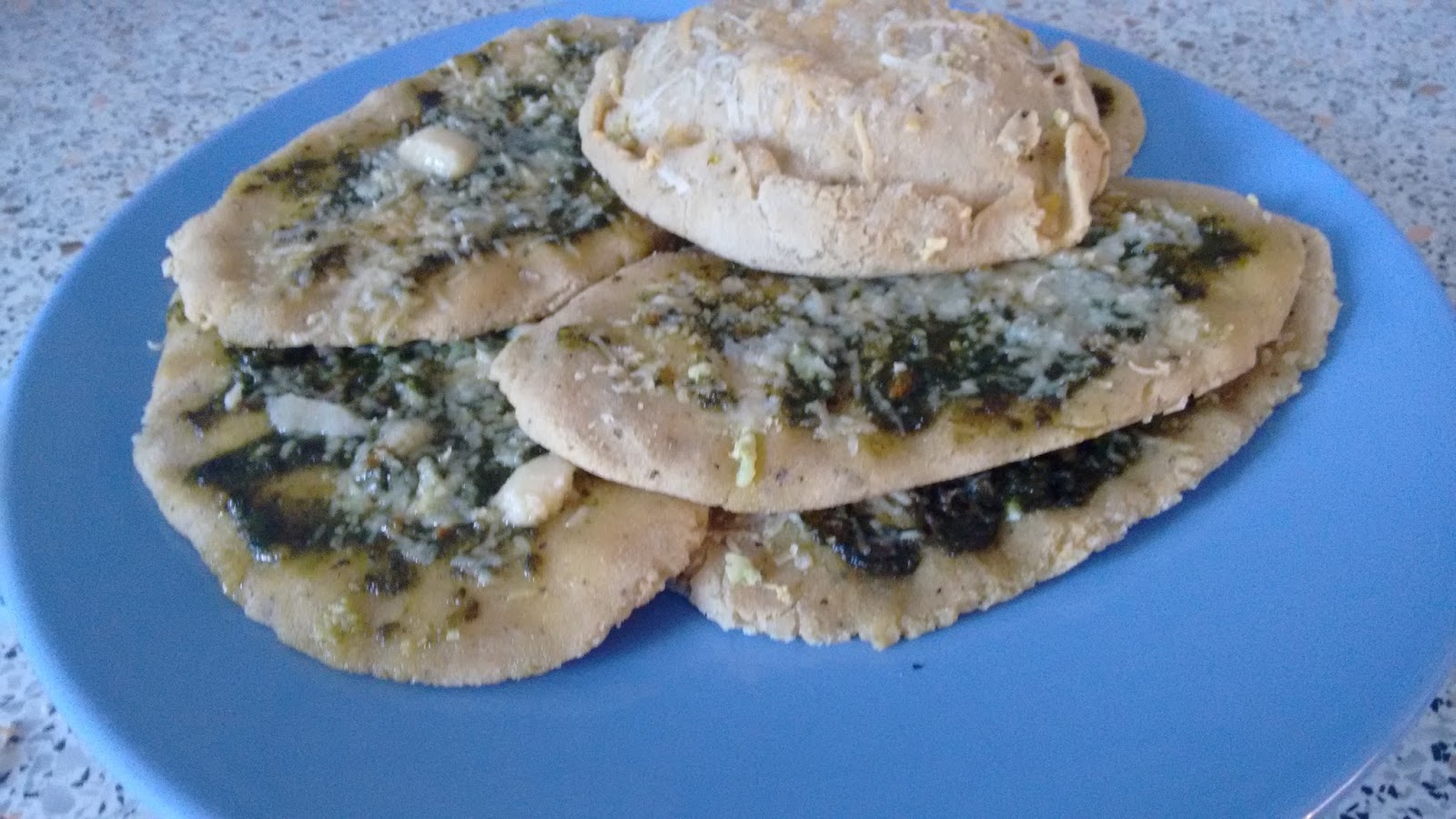 Van het laatste restje rijstmeel maakte ik vandaag pizzabroodjes: platte broden besmeerd met knoflookolie & pesto en met wat kaas erover. Goed te doen en ze worden zo in de vriezer geschoven om als basis te dienen voor als de mannen echte pizza eten. Dan neem ik zo’n pizzabroodje en beleg dat met groenten en klaar.