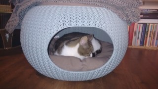 Nee, dan Dibbes. Die heeft onvermoede talenten. Door zijn speelse karakter zou hij het uitstekend doen als circusartiest want hij vindt het leuk om stuntjes uit te halen, in dozen te springen en zich te verstoppen. Dus die springt nu braaf in alle manden waar ik iets in verstop. Hij vindt het zo leuk dat hij nu regelmatig alvast klaar gaat liggen. Over conditionering gesproken. Nu heel voorzichtig leren dat het ook nog leuk is als het deksel dicht gaat.