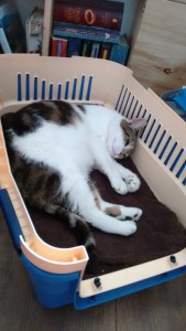 Trouwe lezers weten dat het nogal een gedoe is om de exzwerfkatten in de reismand te krijgen, daar schreef ik al vaker over. Dibbes wordt eerst zwaar gedrogeerd en dan nog is het hel, voor hem en ons. De laatste keer heeft hij al zijn nagels kapot gekrabd en was hij dagen erna onbenaderbaar. Gerrie stapte de eerste keer na weken trainen wel braaf in de mand. Na weken van trainen met lekkere hapjes lukte dat. Tot het eindigde in een reis naar de dierenarts waar hij werd gecastreerd en ge-ent en toen was het uit met de pret.