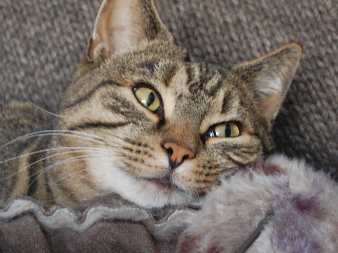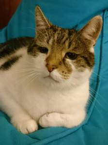 Kijk. Dit is geen gewonde vinger maar een vinger met opzettandpoetsdoekje, eigenlijk bedoeld voor kittens om te wennen aan gebitsreiniging. Hij liet het toe. Niet van harte maar toch. De aangeschafte kattentandenpasta was een brug te ver en mocht ik in mijn haar smeren maar werd door de andere katten wel gewaardeerd.