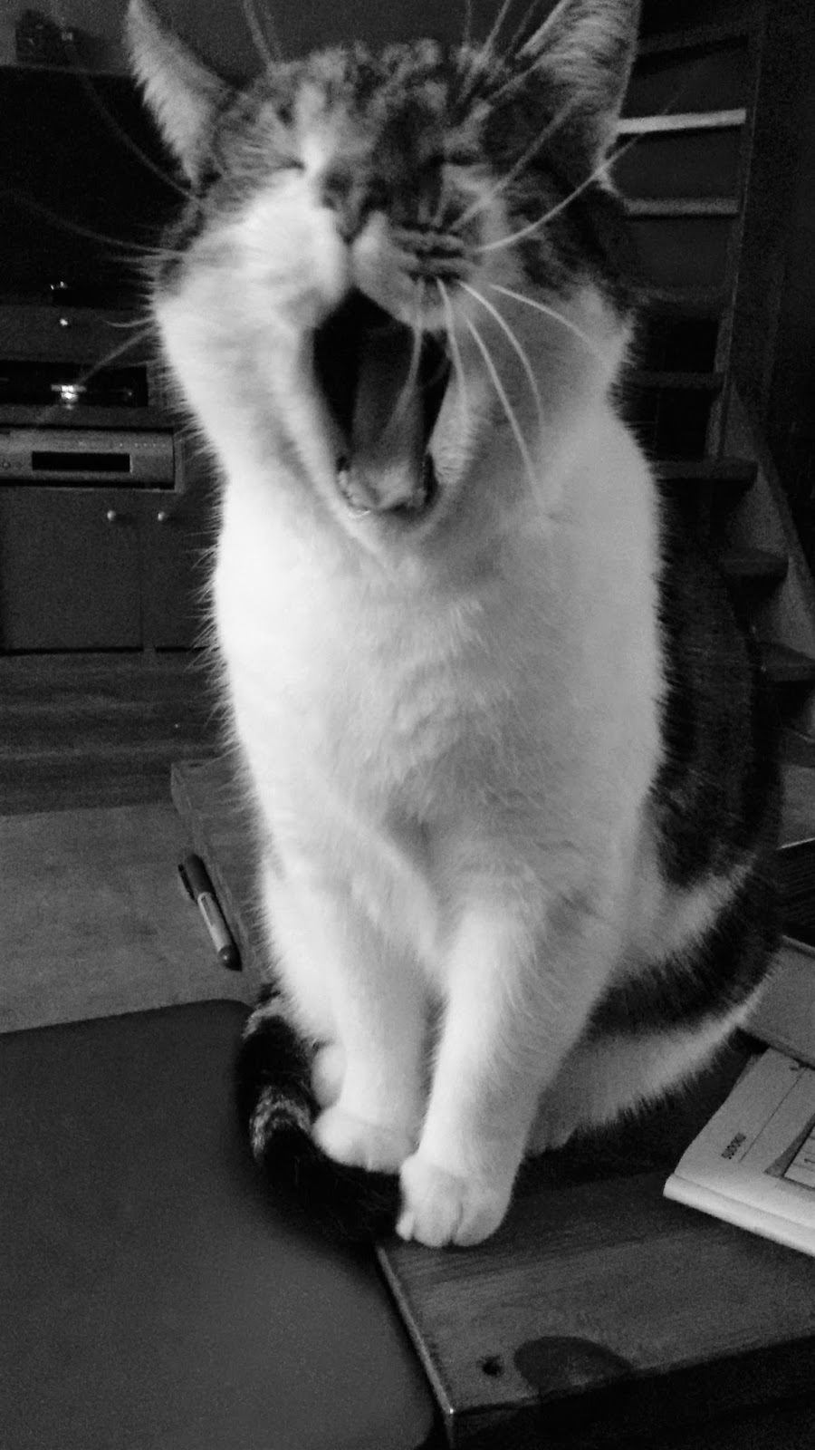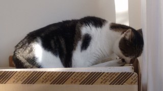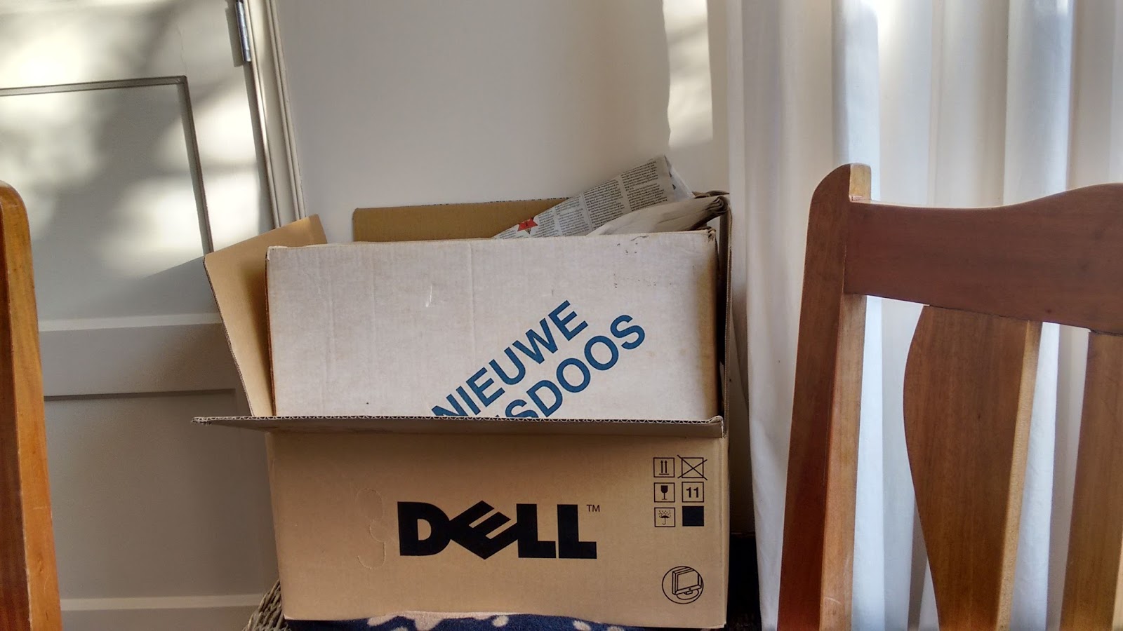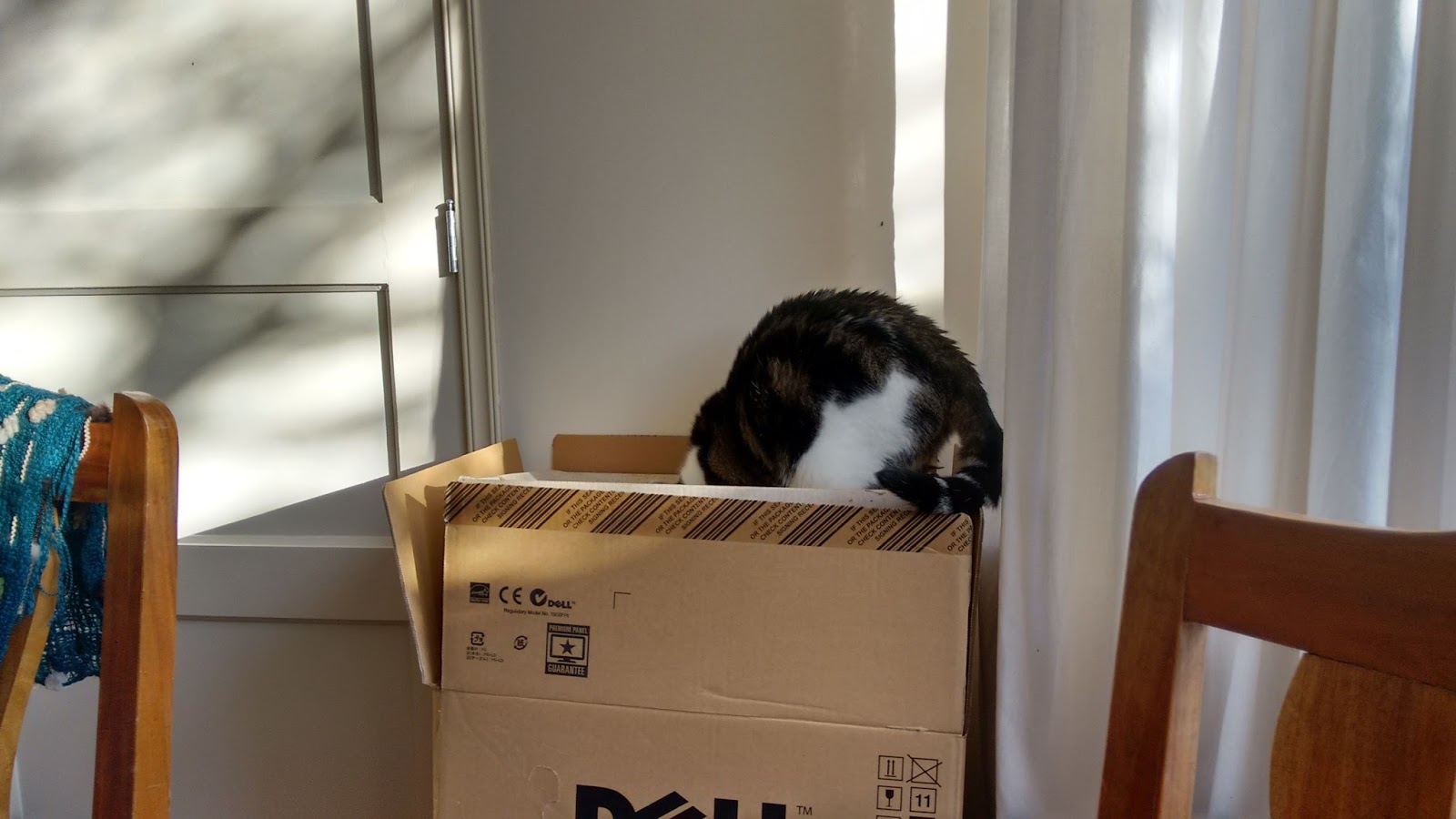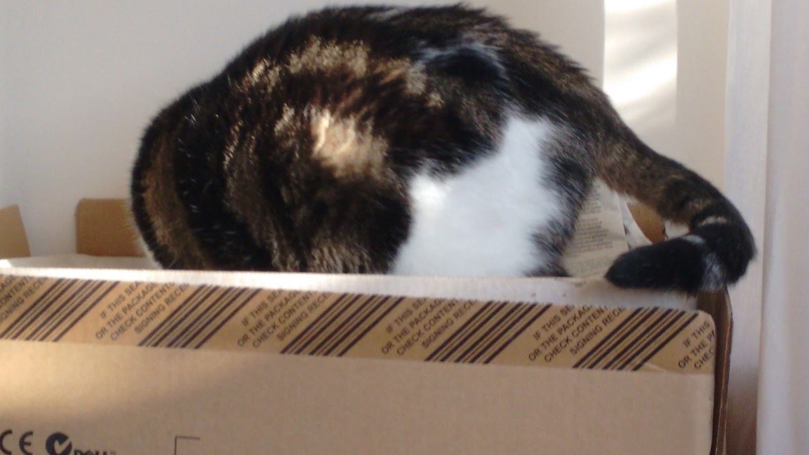 Dat de angst en onzekerheid nog steeds zeer aanwezig zijn, zag ik deze week. In de huiskamer stond een grote lege doos. Dibbes is als echte kat dól op dozen dus sprong hij erin, eruit, erin, eruit. Om vervolgens ineens als een idioot heen en weer te rennen, trap op, trap af. Volledig in paniek. Er bleek een stuk tape aan zijn staart te zijn vastgeplakt. In die doos zat blijkbaar van dat afplaktape waar je dozen mee dichtmaakt en dat hing aan zijn staart.