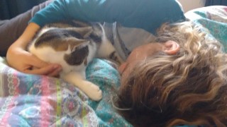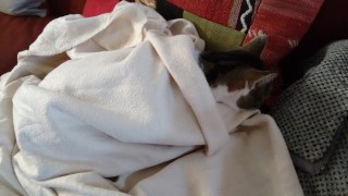 Uiteindelijk ben ik plat op mijn buik gaan liggen en ben met mijn ene hand hem gaan aaien en met de andere hand op zoek naar zijn staart gegaan. Hij reageerde na een paar minuten goed op mijn stem en mijn aanhalingen dus hij kalmeerde iets. Toen snel met een ruk dat klotetape eraf getrokken. Hij vloog onder het bed vandaan en ging plat op de grond liggen. Daar kroop ik naast hem en toen moesten mens en dier even van de consternatie bijkomen.