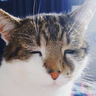 Dibbes woont nu drie jaar bij ons. In mei 2013 zat hij ineens in de tuin, schuw, mager en half blind. Vertrouwen winnen ging heel moeizaam maar in september lukte het om hem te aaien en vandaar uit maakte hij grote sprongen. In oktober brachten we hem naar de dierenarts voor een algehele check, sterilisatie, chippen en een oogoperatie, aangezien hij entropion had, een aandoening waarbij de wimpels naar binnen groeien.