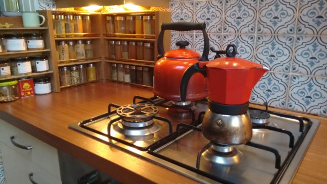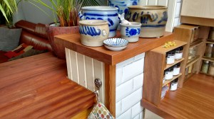 Wat de mannen uiteindelijke deden was de hele keuken slopen tot alleen het geraamte nog stond en zelfs daar werd nog een deel van gesloopt. Ze maakten een massief houten aanrecht en houten deurtjes, vervingen de knoppen van het fornuis, de verlichting, de afzuigkap, vervingen een kast en bouwden in plaats daarvan een ladenkast, maakten van een loze ruimte een kek smal tussenkastje, betegelden over de oude tegels heen en uiteindelijk maakte de man van resthout ook nog een mooi keukenkrukje voor me. Van ander resthout en gekregen stangetjes maakte M. een kruidenkast.