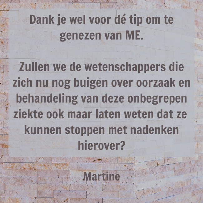 Als dat wel het geval zou zijn zou elke patiënt in de rij staan voor orthomoleculaire therapie, Ephiphora, de Perrin-techniek, Waterstoftherapie, Gupta/Alexander Leven, acupunctuur, Buteykotherapie, de mind-body benadering. Allemaal therapieën die claimen dat er op het gebied van ME veel vooruitgang te boeken is. Maar waar zijn die herstelde patiënten dan? Ik ken ze echt niet.