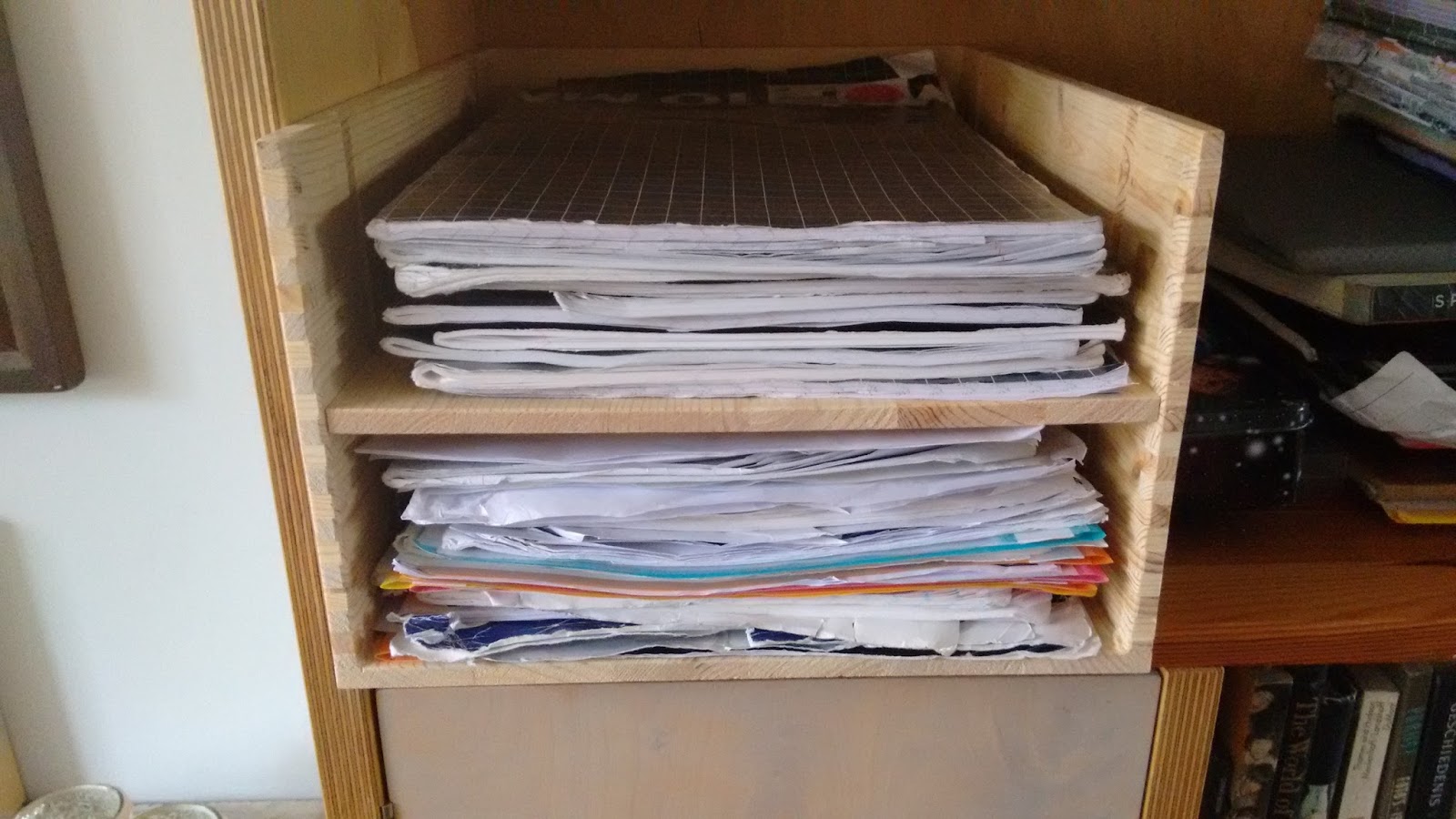 Tijd voor een opruiming dus. Ik gooide papiertroep van zeker 20 jaar verzamelen weg en bewaarde alleen dat wat volgens de Belastingdienst bewaard moest worden. Ik hield 3 mappen over, dat ruimde lekker op!