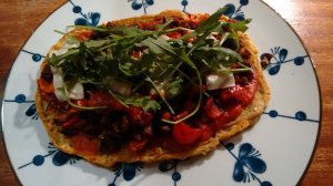 Avondeten is zoals uit het uitkomt. Soms pasta van peulvruchten of zelf gesneden van zoete aardappel of knolselderij. Vaak met geroosterde groenten (koolraap, knolselderij, wortel, zoete aardappel, spruitjes) uit de oven. Heel soms iets met rijst. Een keer per week bak ik een soort naanbroodjes van amandelmeel , tapiocameel en rijstmeel en dat kan belegd worden als een pizza of als stokbrood gegeten worden bij de maaltijd. Ik maak daar dan soms een zuivelvrije tsatsiki bij (op basis van gepureerde tofu en notenmelk) en samen met geroosterde groenten en rauwkost is dit meer dan genoeg. De mannen eten daar dan nog vaak iets van kip bij.