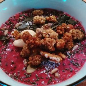 - Notenmelk gepureerd met bessen, framboos en boerenkool. Met een granolatopping.