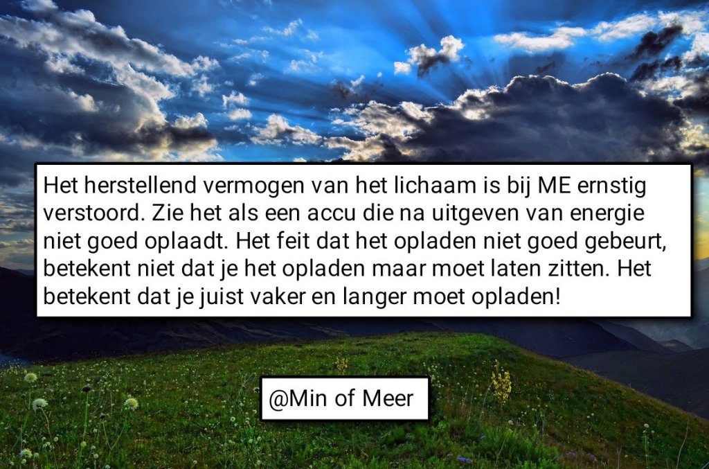 Het herstellend vermogen van het lichaam is bij ME ernstig verstoord. Zie het als een accu die na uitgeven van energie niet goed oplaadt. Het feit dat het opladen niet goed gebeurt, betekent niet dat je het opladen maar moet laten zitten. Het betekent dat je juist vaker en langer moet opladen!